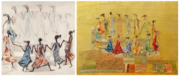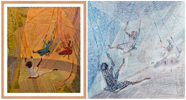 A roda de meninas, o menino com o diabolô, as mulheres na lavoura, todos ganharam releituras bordadas, cheias de texturas, cor e beleza.